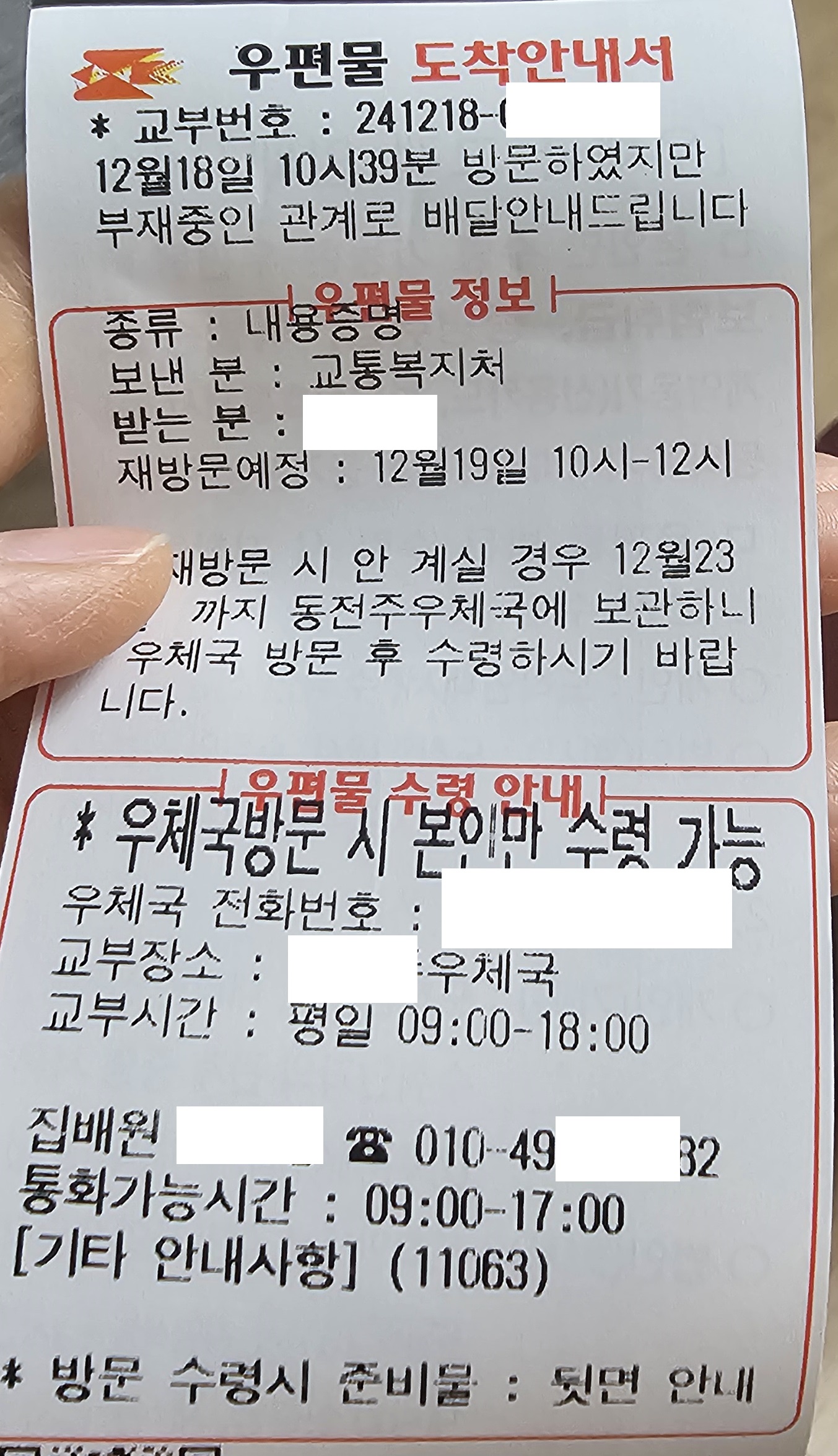두려운 마음에 검색해 봐도 내용은 안 나온다. 집배원에게 전화해 봤으나, 내용은 당연히 그도 모르며, 대리수령 안 되며, 배송지 변경 불가. 어차피 내일도 출근 때문에 수령 못 할 테니, 결국 참지 못하고 당장 받으러 가서 확인했다.