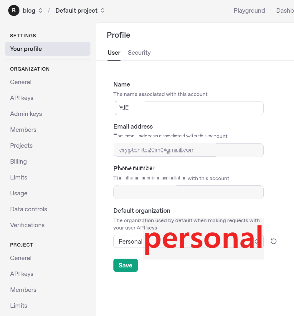 만약 personal 옵션이 보이지 않는다면, OpenAI 지원팀에 문의하여 조직 설정을 초기화하는 방법을 안내받을 수 있습니다.