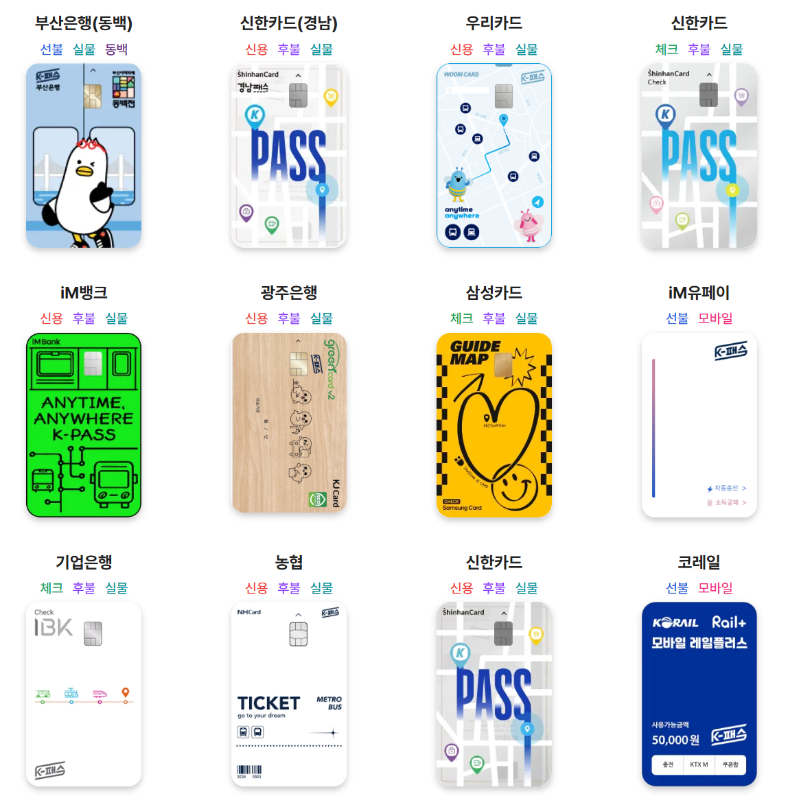 아래 카드 사진 누르시면 카드사별 카드 신청페이지로 연결됩니다. (출처 K패스 홈페이지(K-패스 홈페이지))